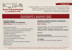 Ο Δήμος Νίκαιας- Αγίου Ιωάννη Ρέντη τιμά την 82η επέτειο από τη Μάχη της Κοκκινιάς, που πραγματοποιήθηκε στις 6, 7 και 8 Μαρτίου 1944, διοργανώνοντας εκδηλώσεις μνήμης την Παρασκευή 6 Μαρτίου 2026.
