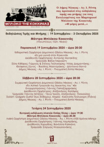 Ο Δήμος Νίκαιας – Αγ. Ι. Ρέντη διοργανώνει εκδηλώσεις μνήμης και τιμής από τις 19 Σεπτεμβρίου έως τις 3 Οκτωβρίου 2025 στη Μάντρα Μπλόκου Κοκκινιάς (Ηλιουπόλεως 102Α, Νίκαια) και σε κεντρικά σημεία της πόλης. Πρόκειται για ένα πολυδιάστατο πρόγραμμα με συναυλίες, θεατρικές παραστάσεις, ποιητικές βραδιές και την κεντρική τελετή μνήμης, με στόχο τη διατήρηση της ιστορικής μνήμης και την απόδοση φόρου τιμής στους εκτελεσμένους του Μπλόκου.