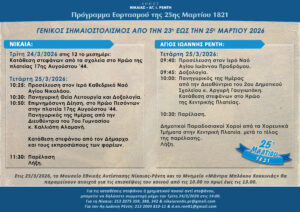 Ο Δήμος Νίκαιας – Αγίου Ιωάννη Ρέντη τιμά την Εθνική Επέτειο της 25ης Μαρτίου 1821 με σειρά εκδηλώσεων που θα πραγματοποιηθούν στη Νίκαια και στον Άγιο Ιωάννη Ρέντη, αποδίδοντας φόρο τιμής στους αγωνιστές της Ελευθερίας.